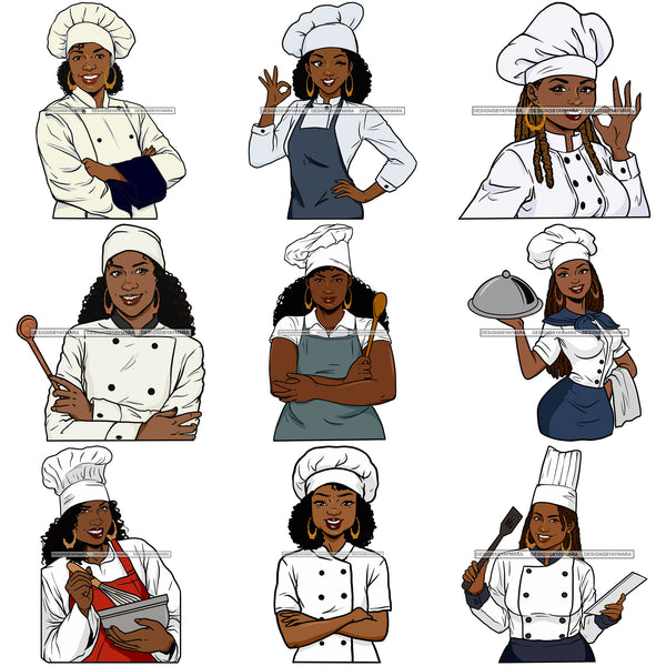 Bundle 9 Chef Afro Woman Culinary Cooking Food Kitchen Cook Professional Cuisine Uniform Profession Business SVG Cutting Files For Silhouette and Cricut