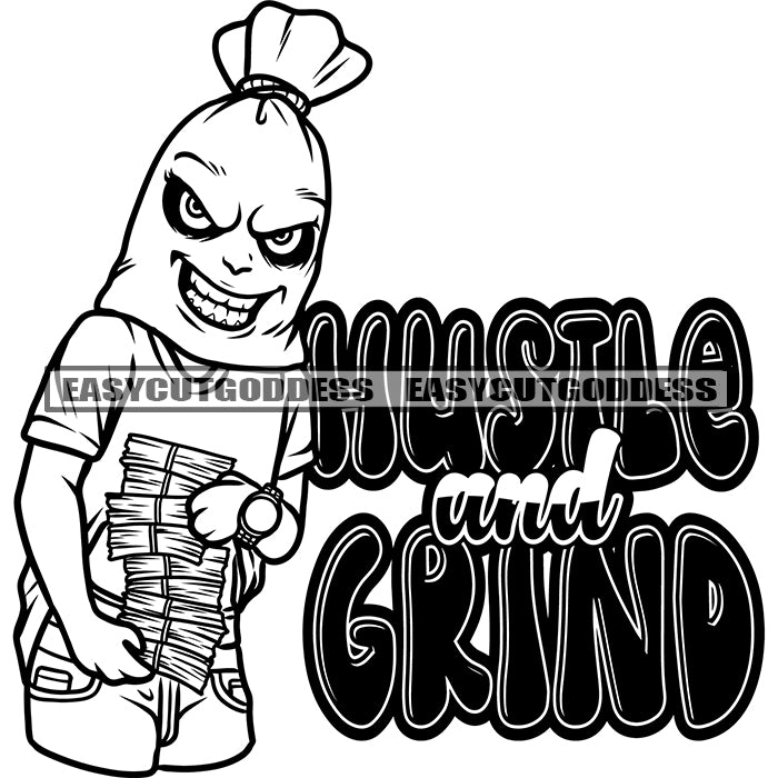 Hustle And Grind Quote Funny Cartoon Character Holding Lot Of Money Bundle Gangster Cartoon Watch On Hand Smile Face Head On Money Bag SVG JPG PNG Vector Clipart Cricut Silhouette Cut Cutting