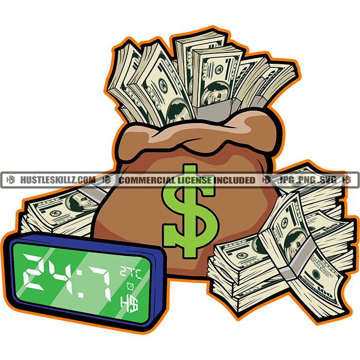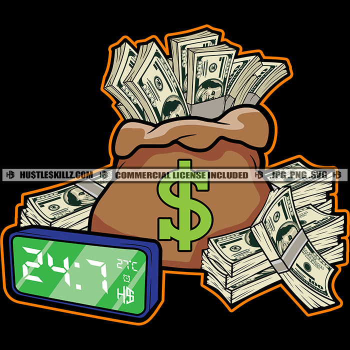 Money Bag Full Load Of Money Bundle On Floor Design Element White Background Time Clock On Money Bag SVG JPG PNG Vector Clipart Cricut Cutting Files