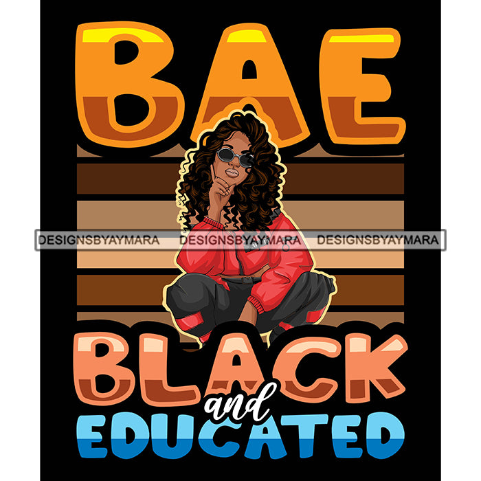 Pretty Woman Squatting Educated Long Curly Shades Brown Stripes Black Background SVG JPG PNG Vector Clipart Cricut Silhouette Cut Cutting