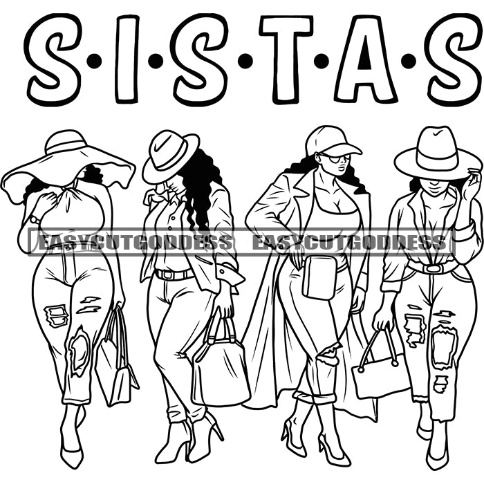 S.I.S.T.A.S Quote Black And White Afro Sisters Women Together Black Woman Morena African American Nubian Wearing Hat Holding Handbag Vector BW Design Element SVG JPG PNG Vector Clipart Cricut Silhouette Cut Cutting