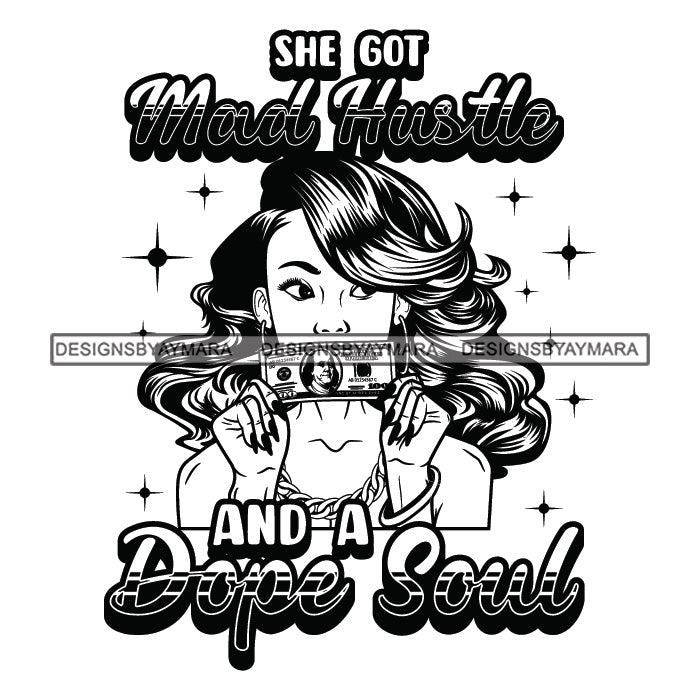 Sassy Afro Woman Hustle Money Quote Business Dollar Long Wavy Hairstyle B/W SVG JPG PNG Vector Clipart Cricut Silhouette Cut Cutting