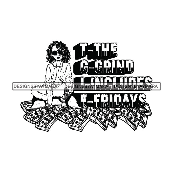 Sassy Afro Woman Hustle Money Quote Business Sunglasses Wavy Hairstyle B/W SVG JPG PNG Vector Clipart Cricut Silhouette Cut Cutting