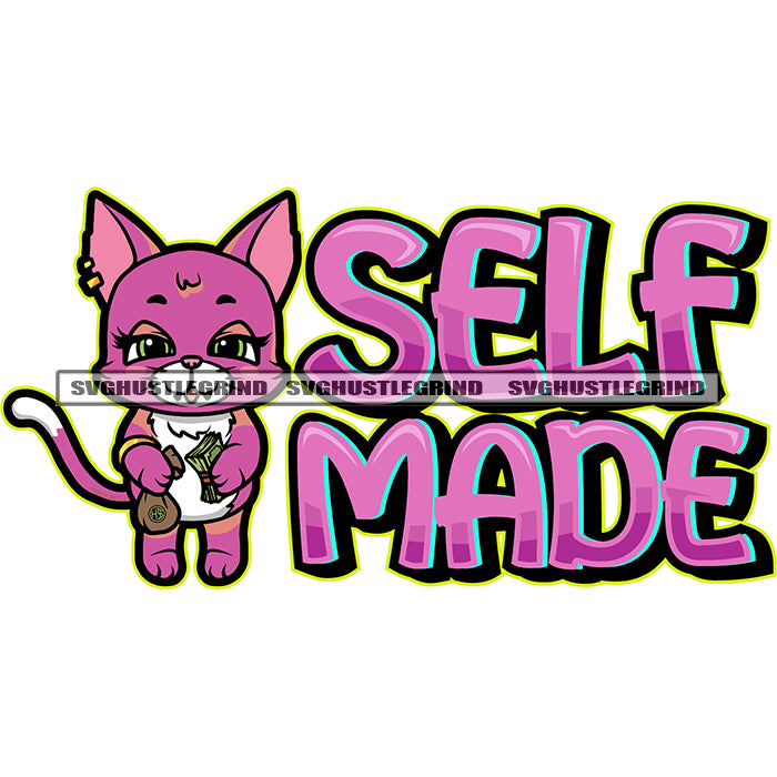 Self Made Color Quote Gangster Cute Cat Standing Design Element Holding Money And Money Bag White Background SVG PNG JPG Vector Cutting Cricut Files