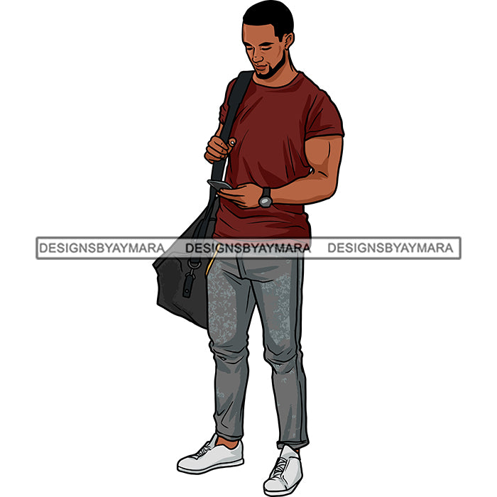 Handsome Afro Man Standing Cellphone Workout Clothes Gym Bag Fashion Style SVG JPG PNG Vector Clipart Cricut Silhouette Cut Cutting