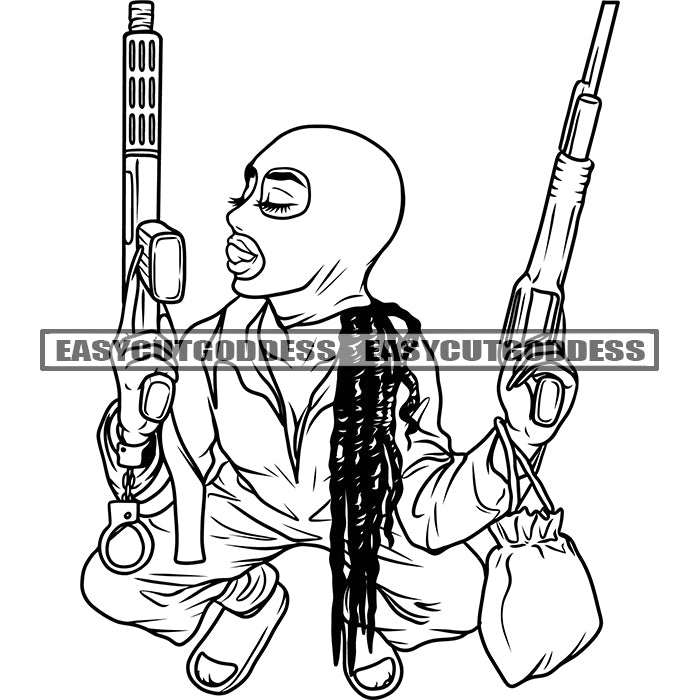 Gangster Woman Holding Gun African American Dangerous Woman Wearing Musk Sitting Pose Afro Woman Locus Hairstyle Vector BW SVG JPG PNG Vector Clipart Cricut Silhouette Cut Cutting