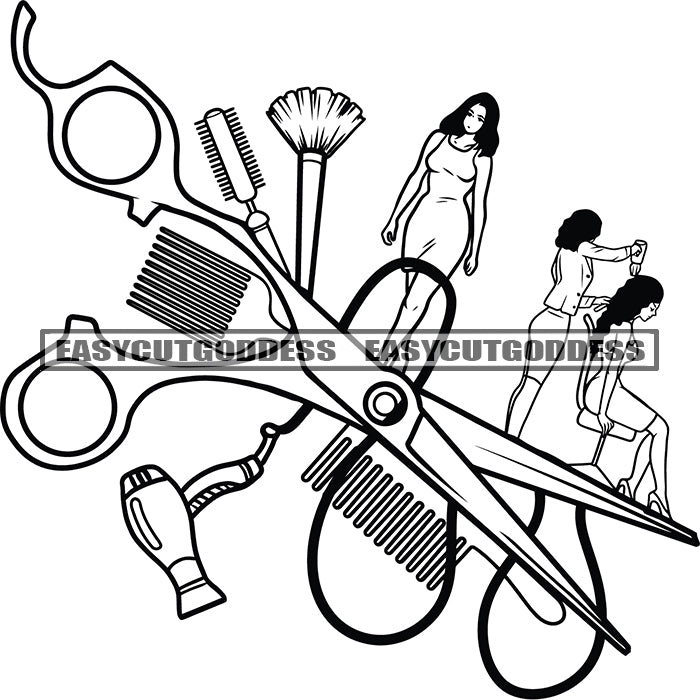 Self Service Paraphernalia Hairdresser Set With Accessories Black And White Artwork Design Element Afro Woman Standing SVG JPG PNG Vector Clipart Cricut Silhouette Cut Cutting