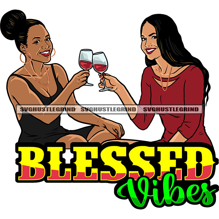 Blessed Vibes Quote Afro Woman Sitting Front Side Holding Wine Glass Smile Face Curly Hairstyle Wearing Hoop Earing Vector White Background Party Time SVG JPG PNG Vector Clipart Cricut Silhouette Cut Cutting