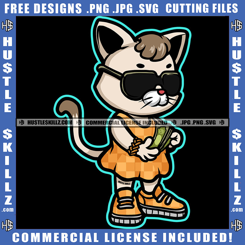 Cartoon Gangster Cat Standing Wearing Sunglass Design Element Cat Holding Money SVG JPG PNG Vector Clipart Cricut Cutting Files