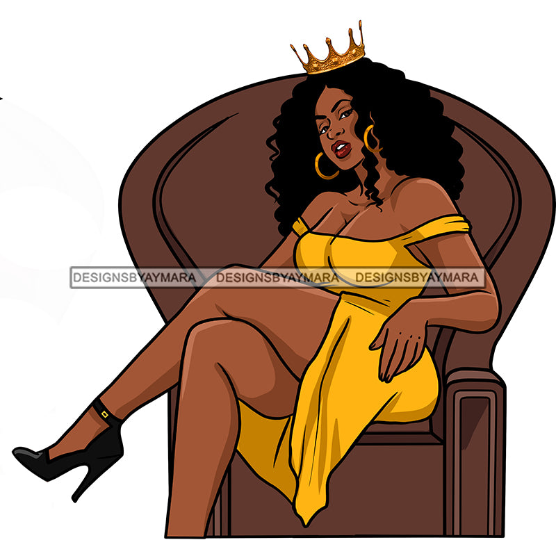 Black Queen Gold Yellow Split Dress Legs Crossed Crown Black Strapped Heels Sitting Brown Throne Chair Smiling Clipart Graphic Skillz JPG PNG Clipart Cricut Silhouette Cut Cutting