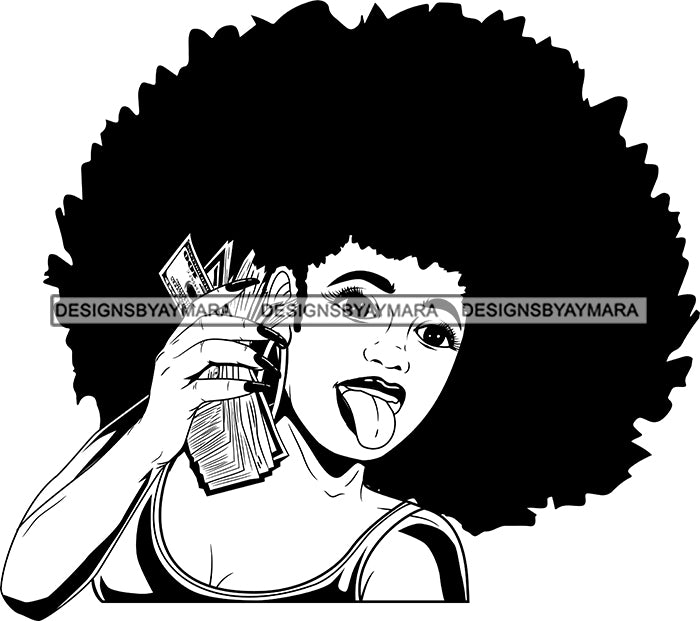 Black Lola With Money Big Afro Tongue Out Black And White SVG JPG PNG Vector Clipart Cricut Silhouette Cut Cutting