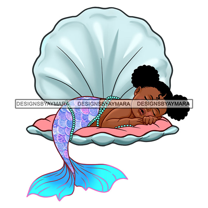Cute Melanin Baby Girl Sleeping Mermaid In Shell Afro Puffs JPG PNG Clipart Cricut Silhouette Cut Cutting